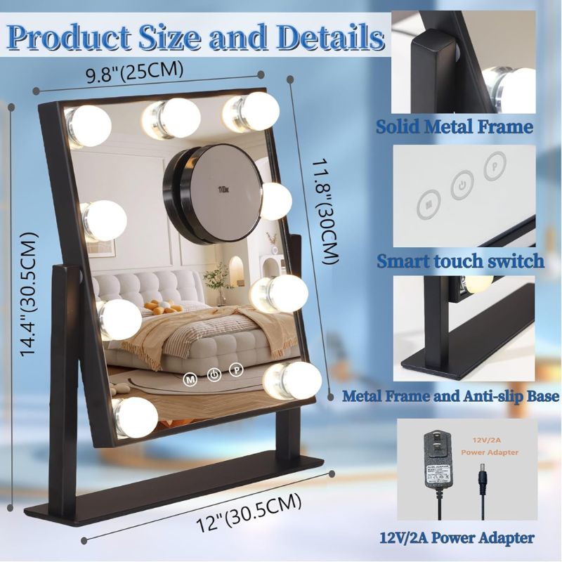 Vanity Mirror with Light: Hollywood vanity mirror with 9 lighted bulbs, stylish and classic, providing a clean and bright reflection and allowing you to get the most natural lights for makeup application.