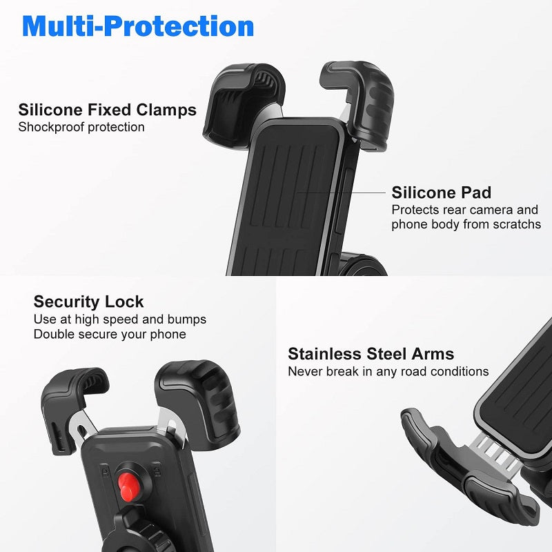 - Shockproof Protection: Our motorcycle phone holder is made of ABS plastic, light and durable, sturdy and shockproof. The built-in rubber pads on the arm protect your phone from scratches.