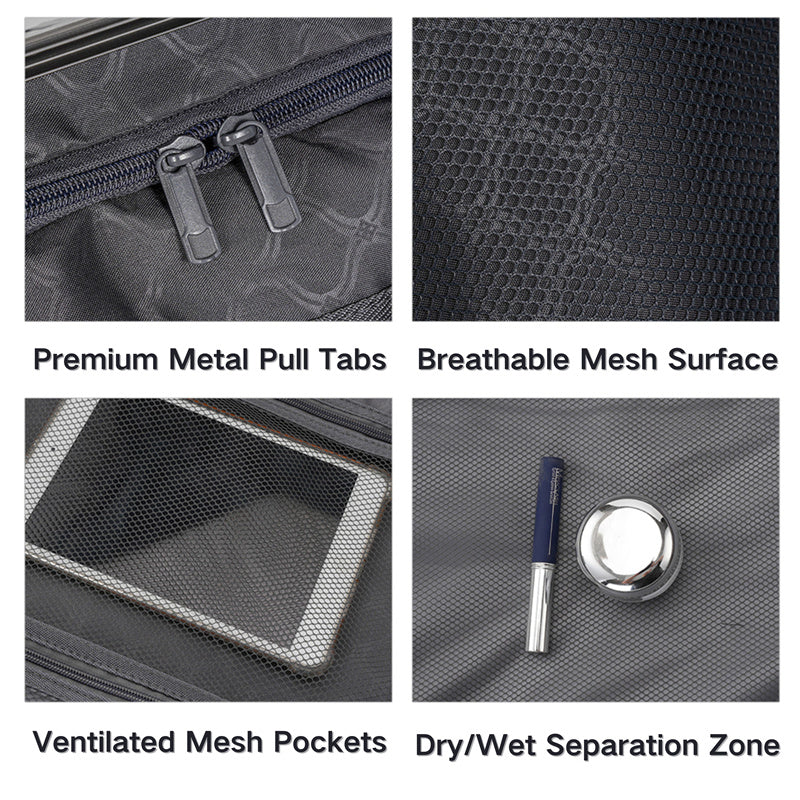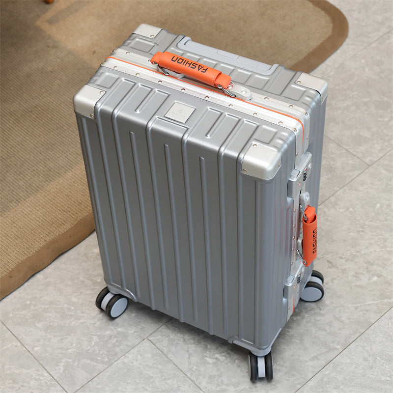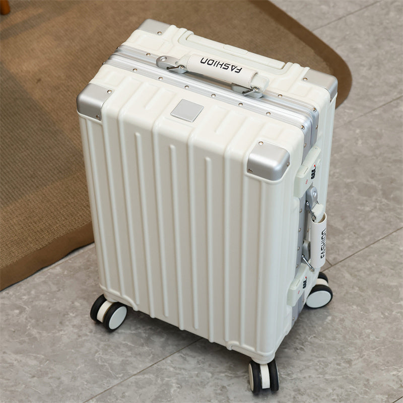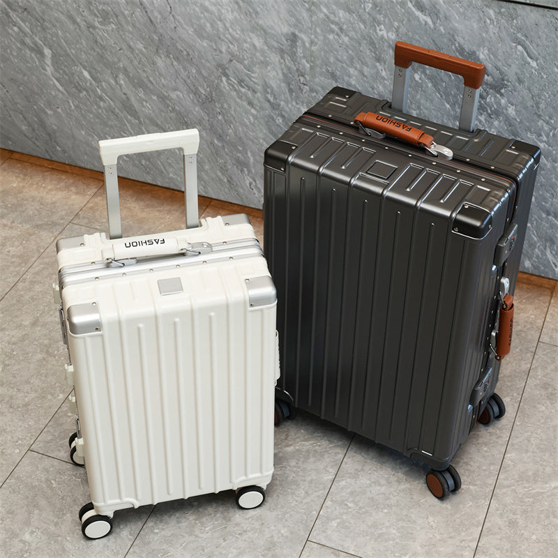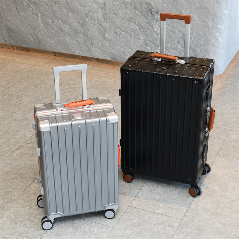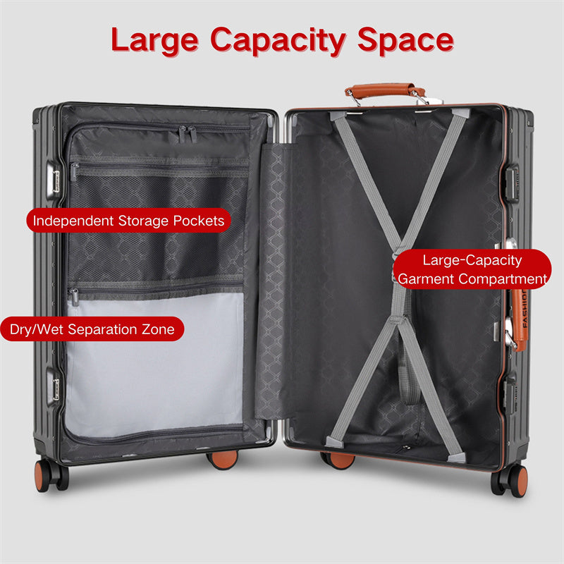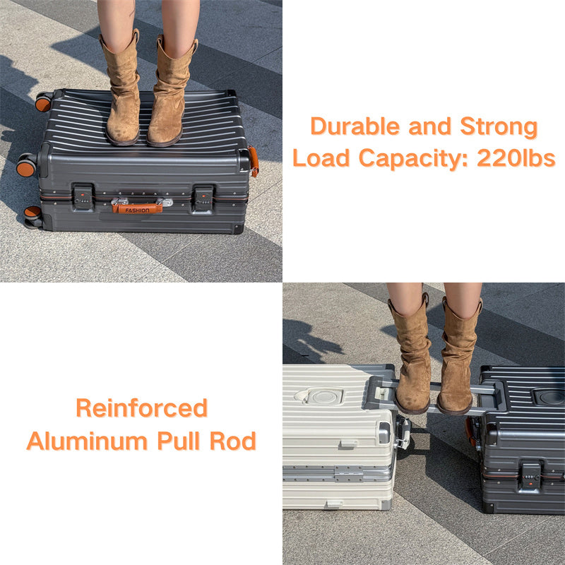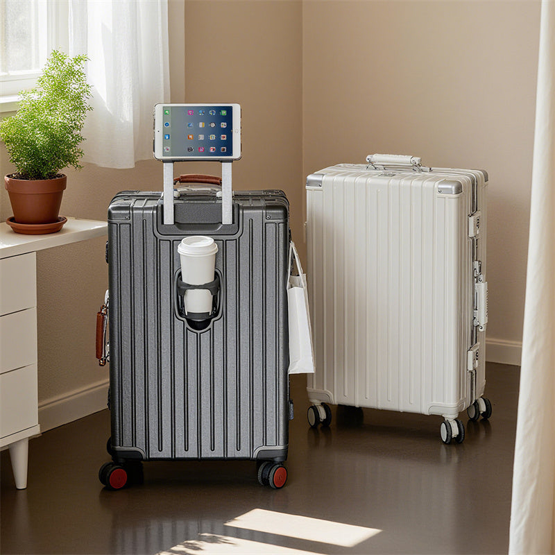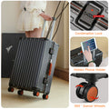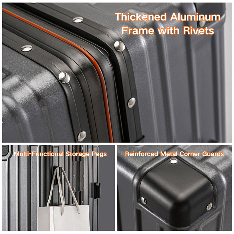 This suitcase features an ABS+PC hard-shell construction with exceptional scratch resistance. Reinforced metal corner guards and an integrated aluminum alloy frame, secured with high-density rivets, ensure durability even during rough handling. The lightweight yet sturdy shell provides superior protection while remaining easy to carry.