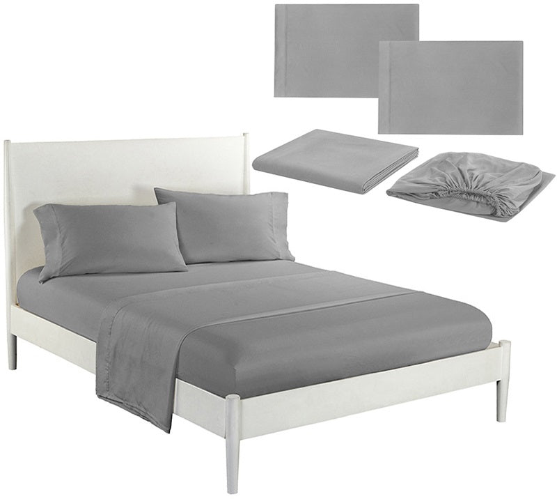 Each set contains a flat sheet, a fitted sheet, and two pillowcases except for the Twin size that has one pillowcase.