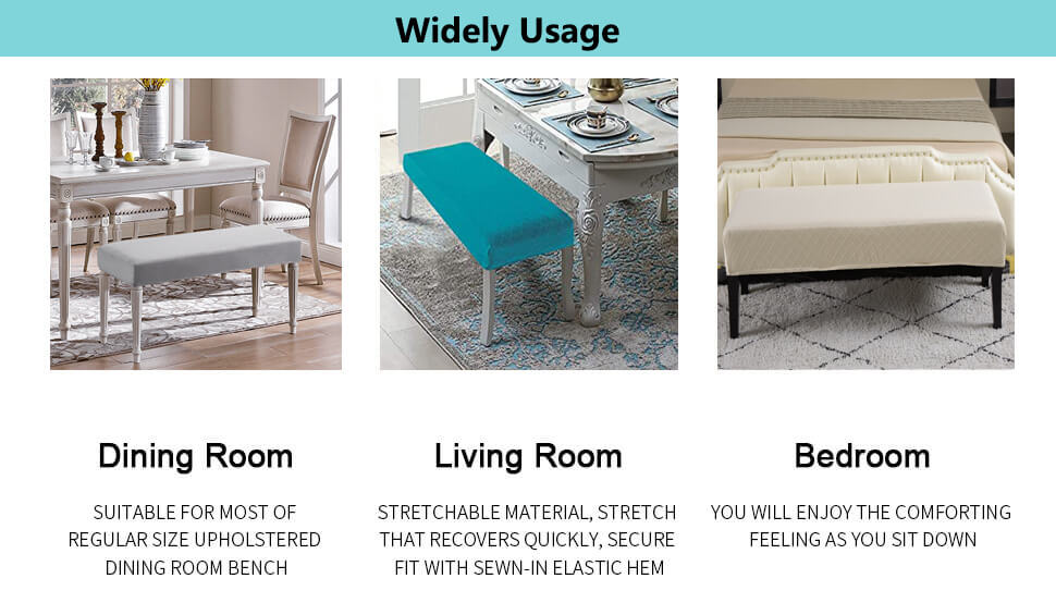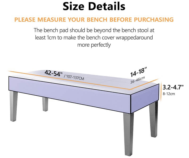 - Perfect Size--Stretch bench cover fit most of the regular size upholstered dining bench and have available in a variety of colors. Bench length 42-54" and bench width 14 - 18", bench cushion thickness: 3.2 -4.7".