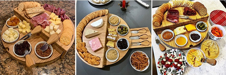 - The All in One Charcuterie Board Set: The cheese board and knife set feature a hidden slide-out tray for cutlery. Making storage a snap and always keeping the cheeseboard set together when not in use.