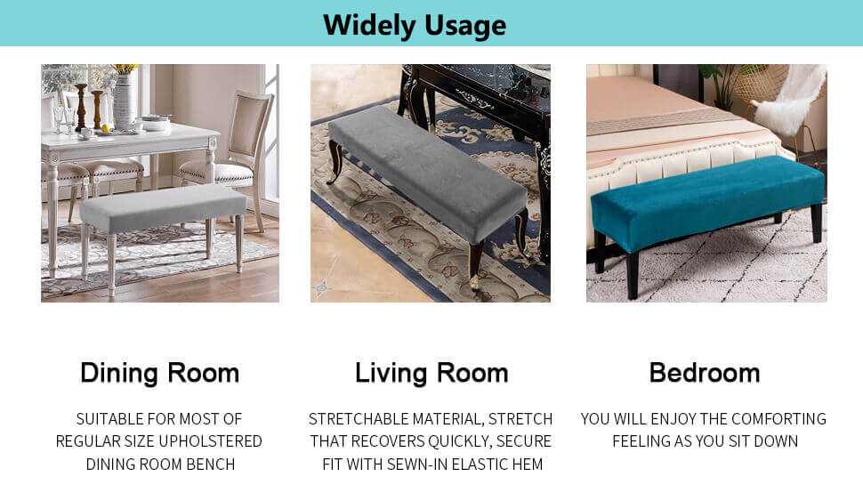 This velvet bench covers not only protect your expensive upholstered bench from spills, stains, wear and tear; And multiple bright and vibrant colors to match or change your dining room theme.