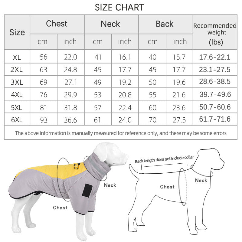 - A: The surface of the dog winter jacket is made of waterproof, windproof, and snowproof material, which keeps your dog dry and comfortable, protects them from rain and snow, and is light in weight. You can walk your dog even in the rainy winter.