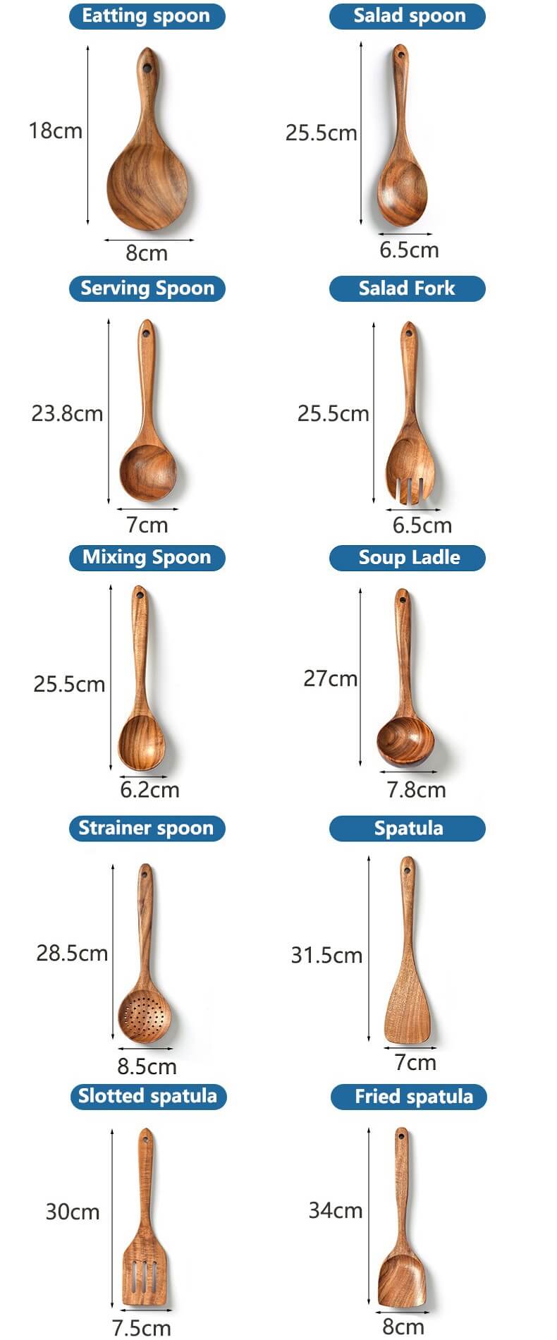 - Made From Natural Teak Wood: Our wooden cooking utensils set are handmade by natural teak wood without any coating. Teak is a good material for making furniture, the longer it is used, the smoother it will be,is not easy to deform, corrode and crack in various environments.